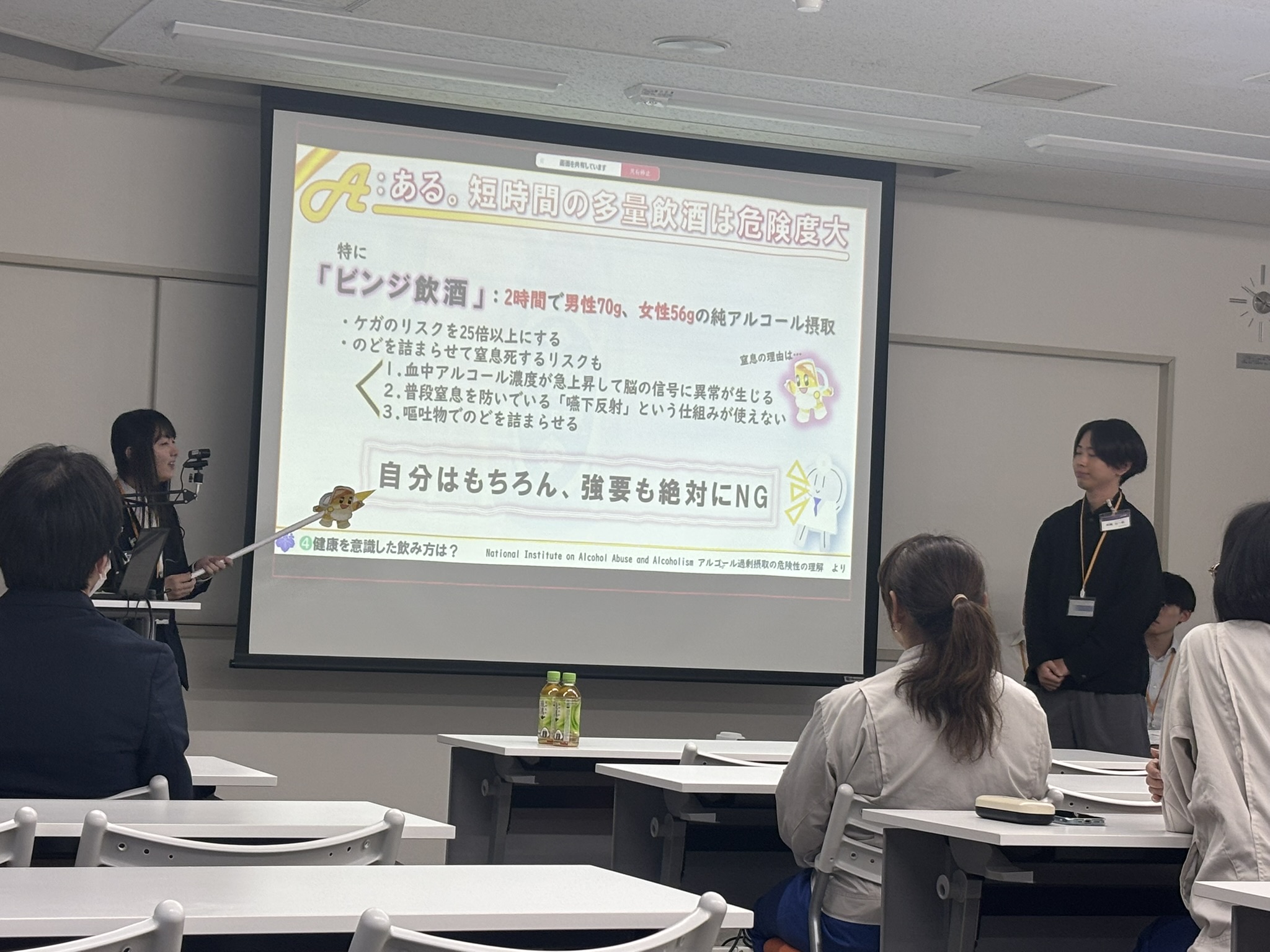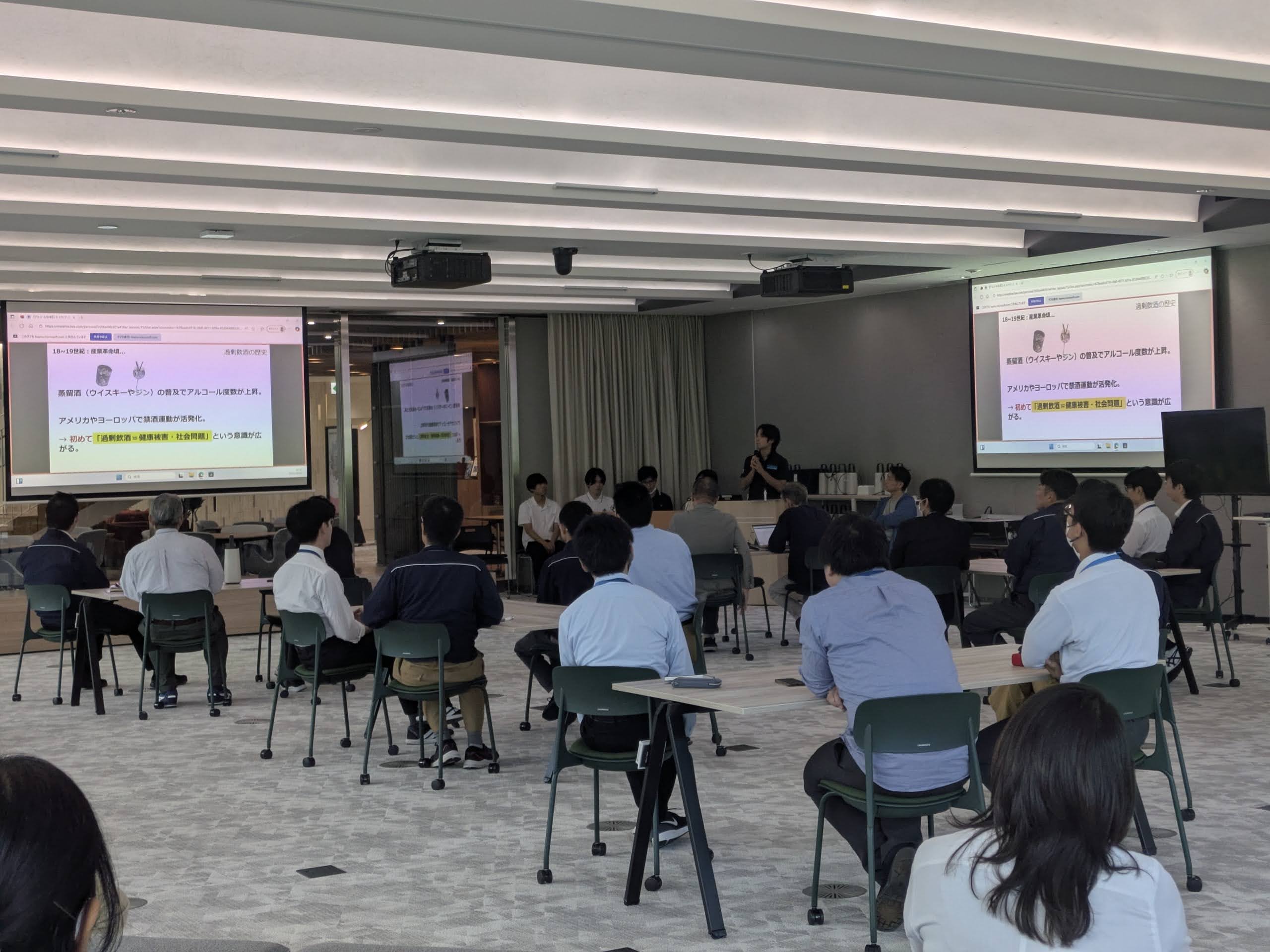 一方、「新菱冷熱工業株式会社 イノベーションハブ」で講座を行った班は、医学だけでなく歴史・社会学・経済学の視点も交え、多角的にアルコールの影響を考える構成としていました。どちらの班も、参加者が飽きずに1時間の講座を楽しめるよう頑張って準備を進め、当日も堂々と発表していました。