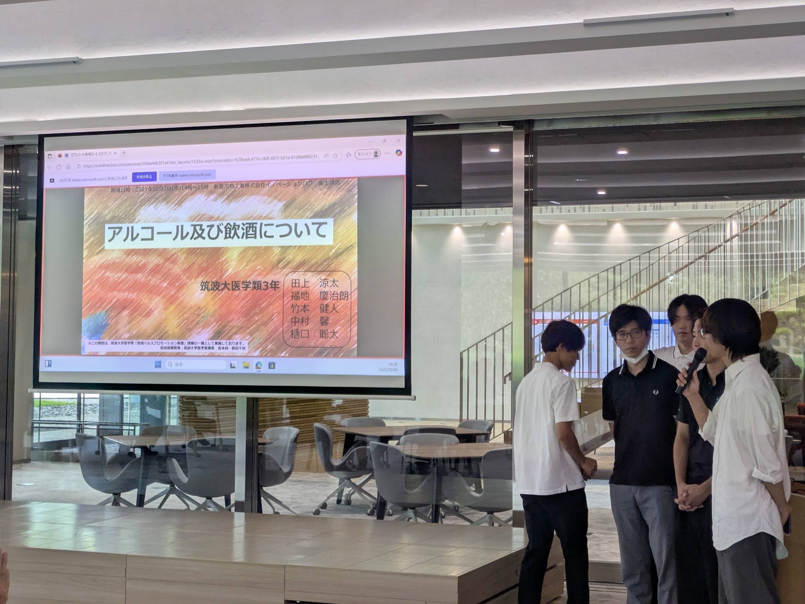 夏の実習(健康講座準備のための3日間)では、アルコールの基礎知識を学ぶとともに、産業医の先生から企業の特性や職場の健康ニーズについて伺い、各班がテーマや構成を検討しました。その後、10月2日と10月27日に、つくば市内の2つの企業で実習を実施しました。