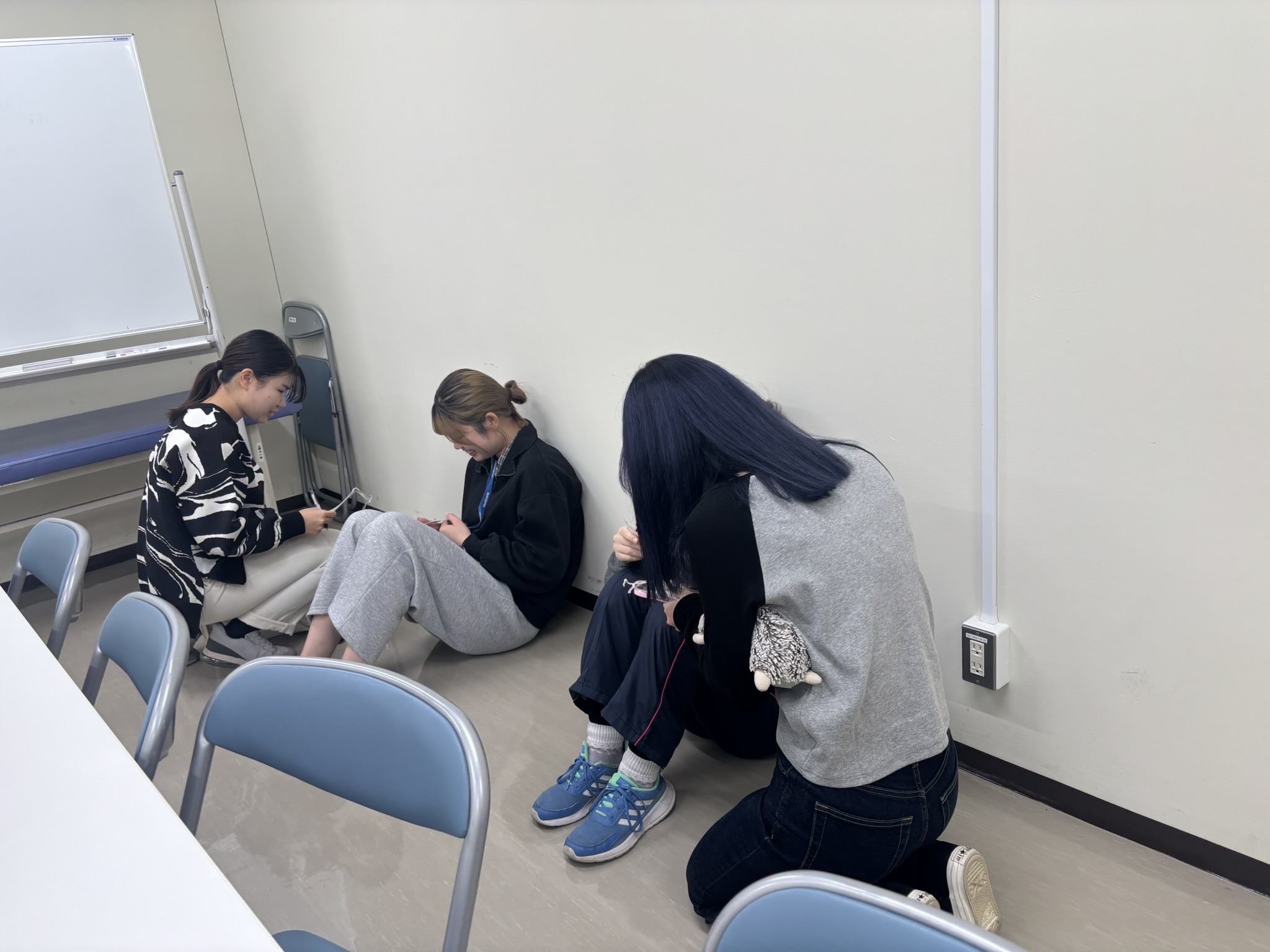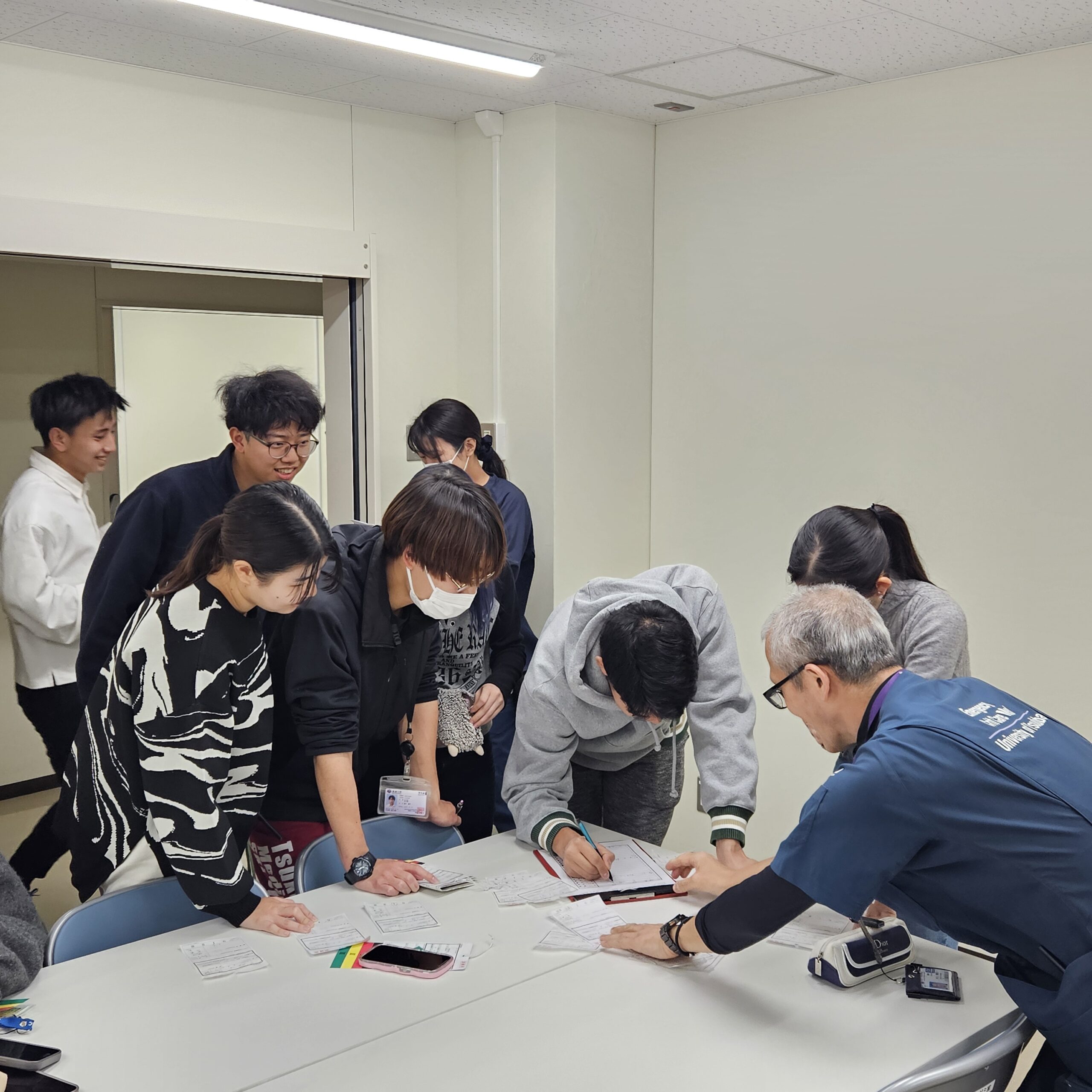トリアージ演習では、「つくばで大地震が発生し、建物内に多数の傷病者が閉じ込められている」という想定のもと、7~8名の班に分かれて実施しました。傷病者役の学生や人形を用い、制限時間内に状況を判断しながらトリアージを行い、必要な情報を整理する訓練を行いました。。