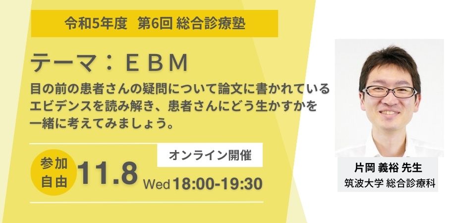 昨年度まで筑波大学総合診療科で講師を務めており、EBM教育に長年携わってきた片岡義裕先生が講義を担当します。
