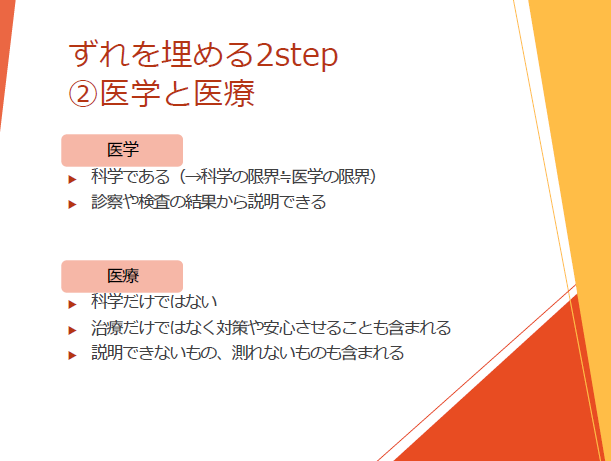 - 診察や検査の結果に立脚した医学と,患者さんの安心に重きを置く医療の違い