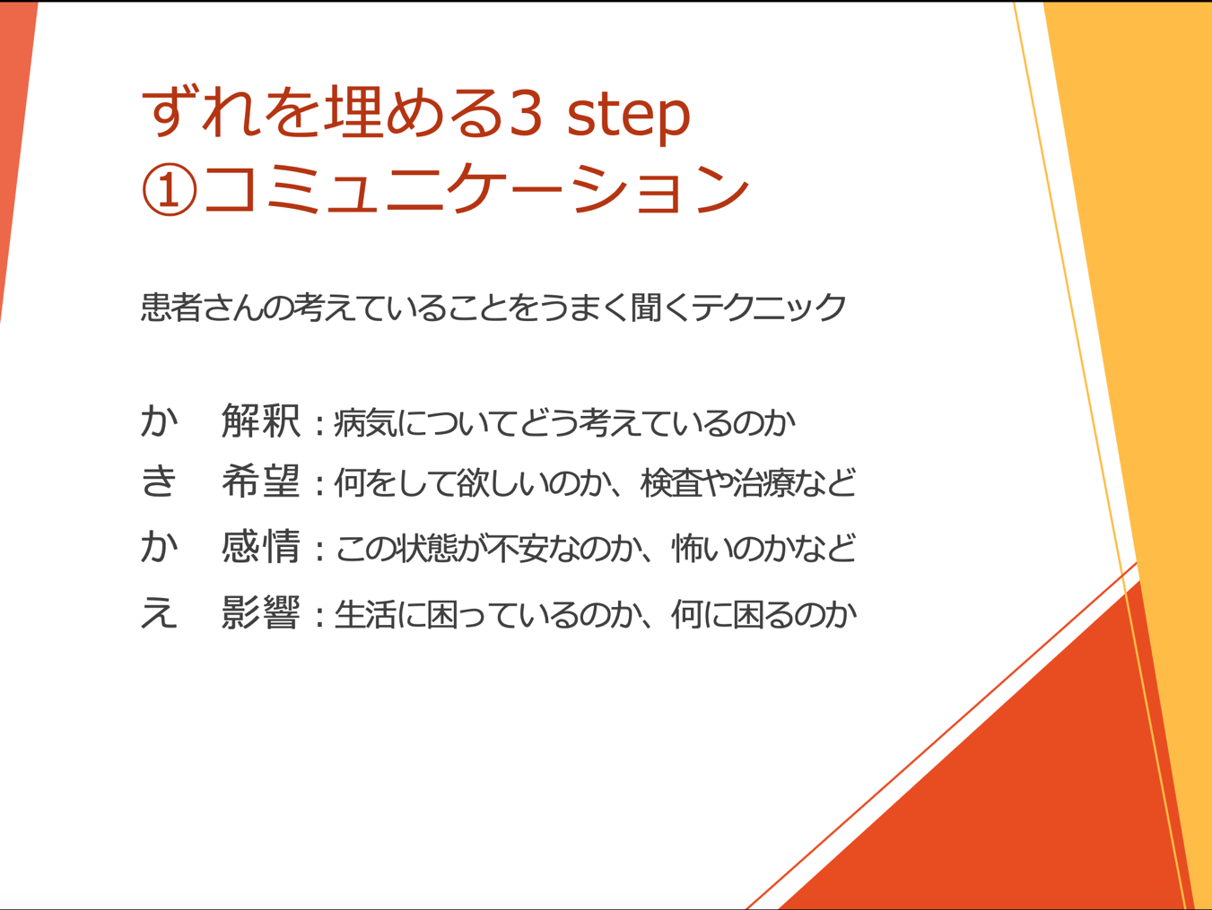 次に、このずれを埋めるための実践方法として、「かきかえ」というコミュニケーションスキルを学びました。「かきかえ」とは、患者の考えていることを整理してうまく聞くためのコミュニケーションスキルであり、解釈(自分の病気への解釈)、希望(医療者への希望)、感情(病気についての感情)、影響(生活への影響)の頭文字をとったものです。