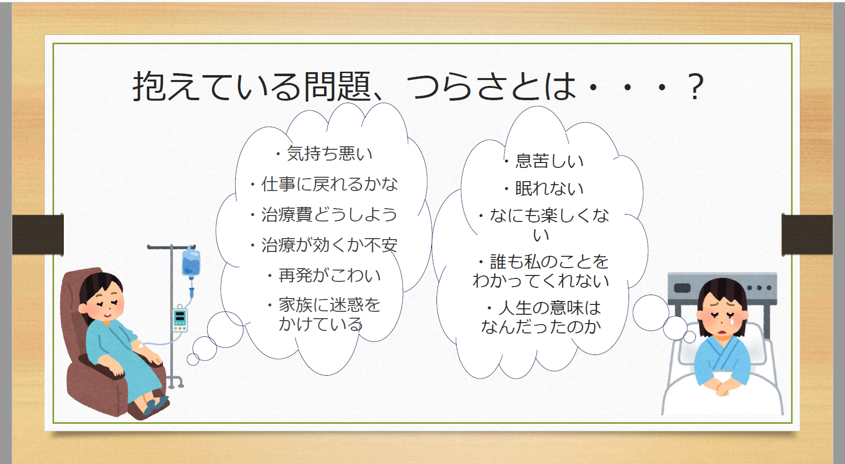 • 緩和ケアについて具体的なケースを交えながら色々考えることができた。