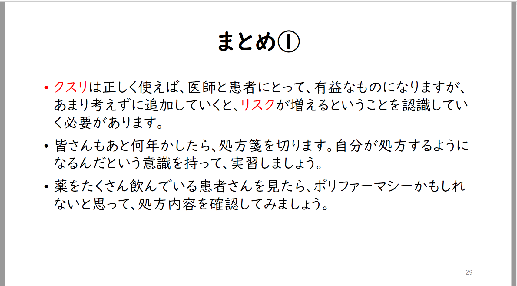 本講義の目標は2つで、「ポリファーマシーという問題があることを認識し、薬の処方について主体的な態度をとれるようになること」、「ポリファーマシーの問題を通して、多職種との連携、患者や家族とのコミュニケーションの重要性を認識すること」です。