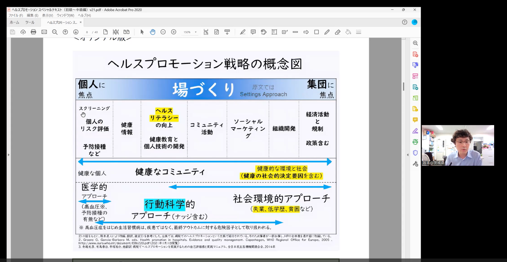 - 講義の後にいただいた資料で紹介されていたヘルスプロモーションの具体例を拝見させていただきましたが、さまざまなアプローチの取り組みがあり、非常に興味深かったです。 私は健康の社会的要因に非常に興味があり、社会的な背景により病気を発症してしまう人や、治療へのアクセスが困難になってしまっている人を救いたいという目標があったが、このヘルスプロモーションの活動はその目標を叶えるために非常に有用だと思った。これからぜひ積極的に参加していきたいと思う。