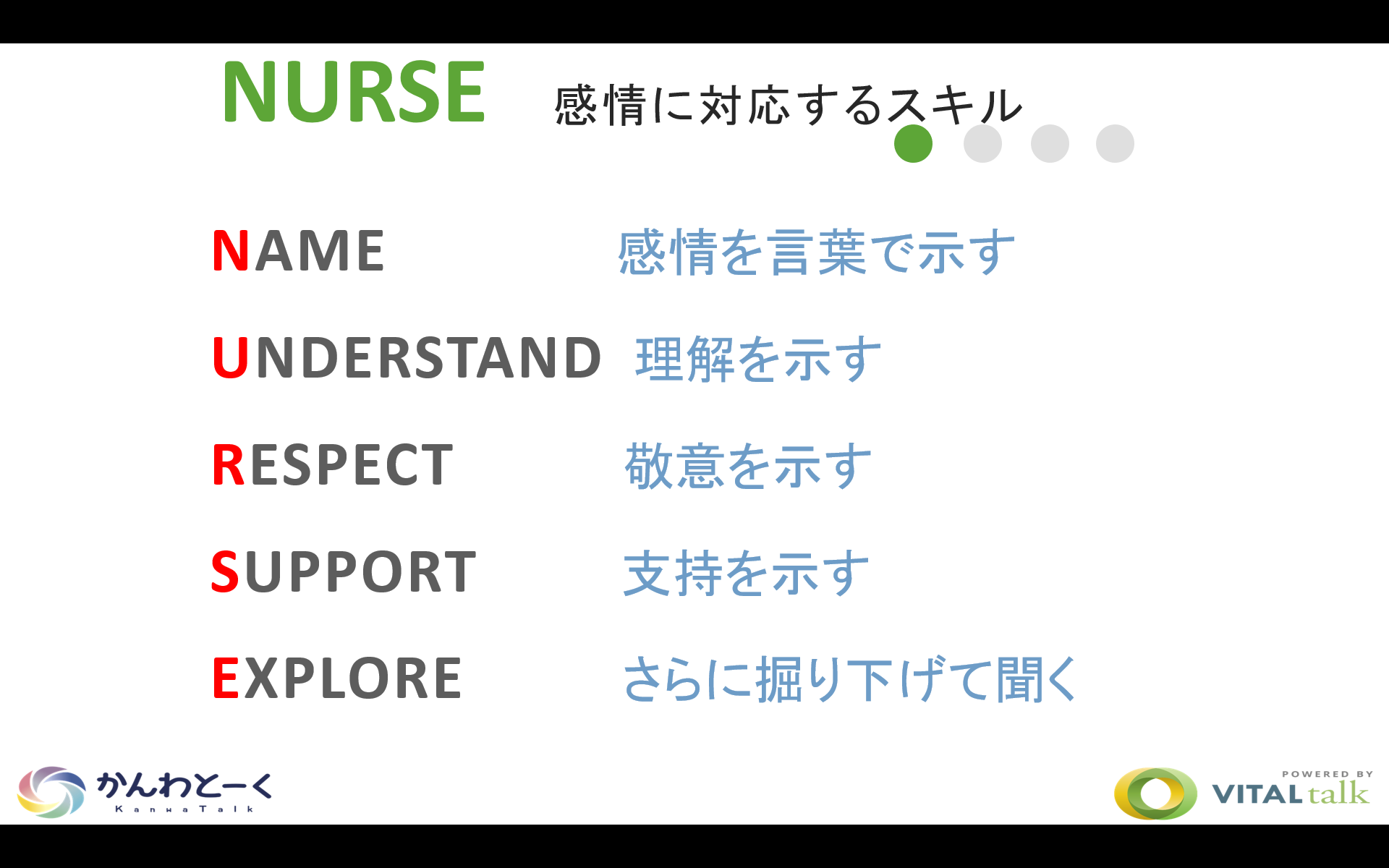 治療ゴール決定のためのロードマップがREMAPという枠組みであって、Reframe(状況の変化を伝える), Expect emotion(感情に対応), Map(重要な価値観を掘り下げる), Align(価値観に基づいた治療ゴールの設定), Plan(具体的な治療計画)のことです。今回は”RE”を学ばせていただきました。そのためにコミュニケーションスキルとしてSPIKESやNURSEをうまく活用する練習を行いました。