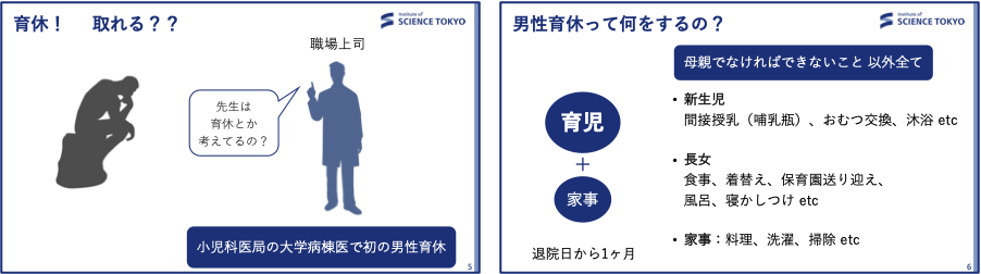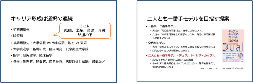 女性医師、男性医師それぞれの立場から、ライフイベントと医師としてのキャリアについて、仕事と育児の両立や、男性として育休を取得された経験についてお話しいただきました。