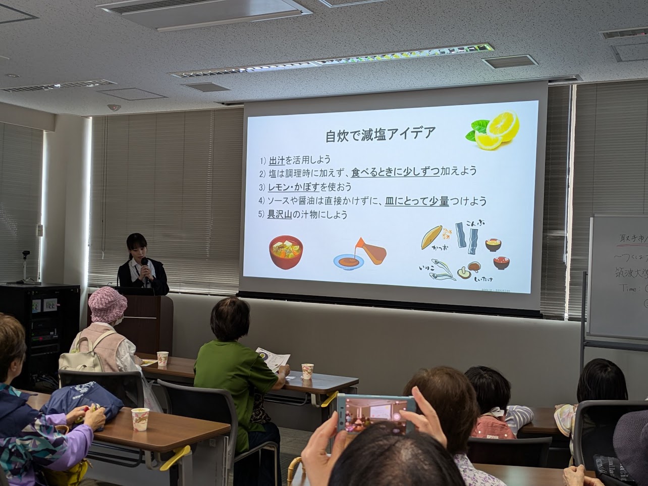 そのうち、まず取手市では食生活改善推進協議会(ヘルスメイト)と取手市立保健センターとのコラボレーション企画として、「健康まつり(主催:取手市)」に医学生が講師として参加し、地域住民に向けて、生活習慣病予防に関する講話を行いました。
