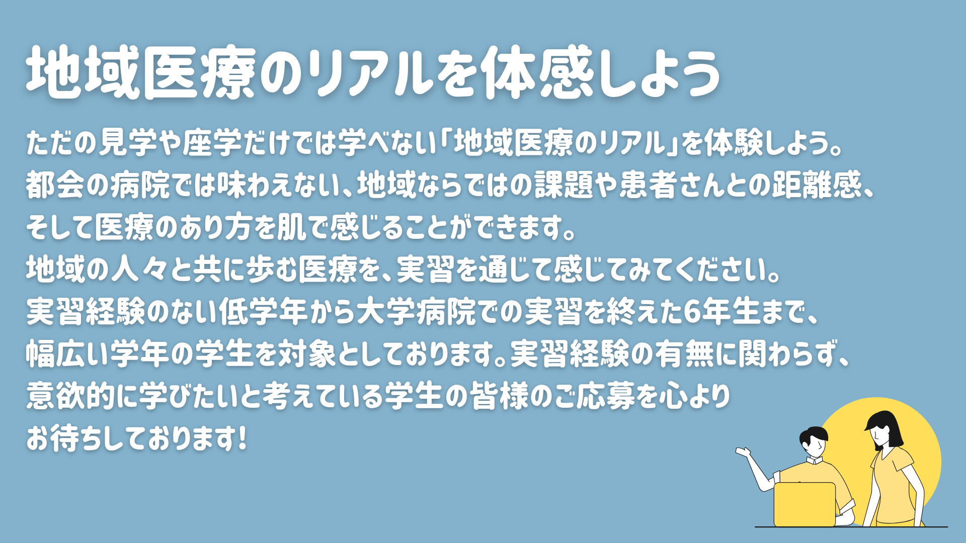 地域ならではの課題や患者さんとの距離感、そして医療のあり方を肌で感じることで、医療の本質に迫ることができます。