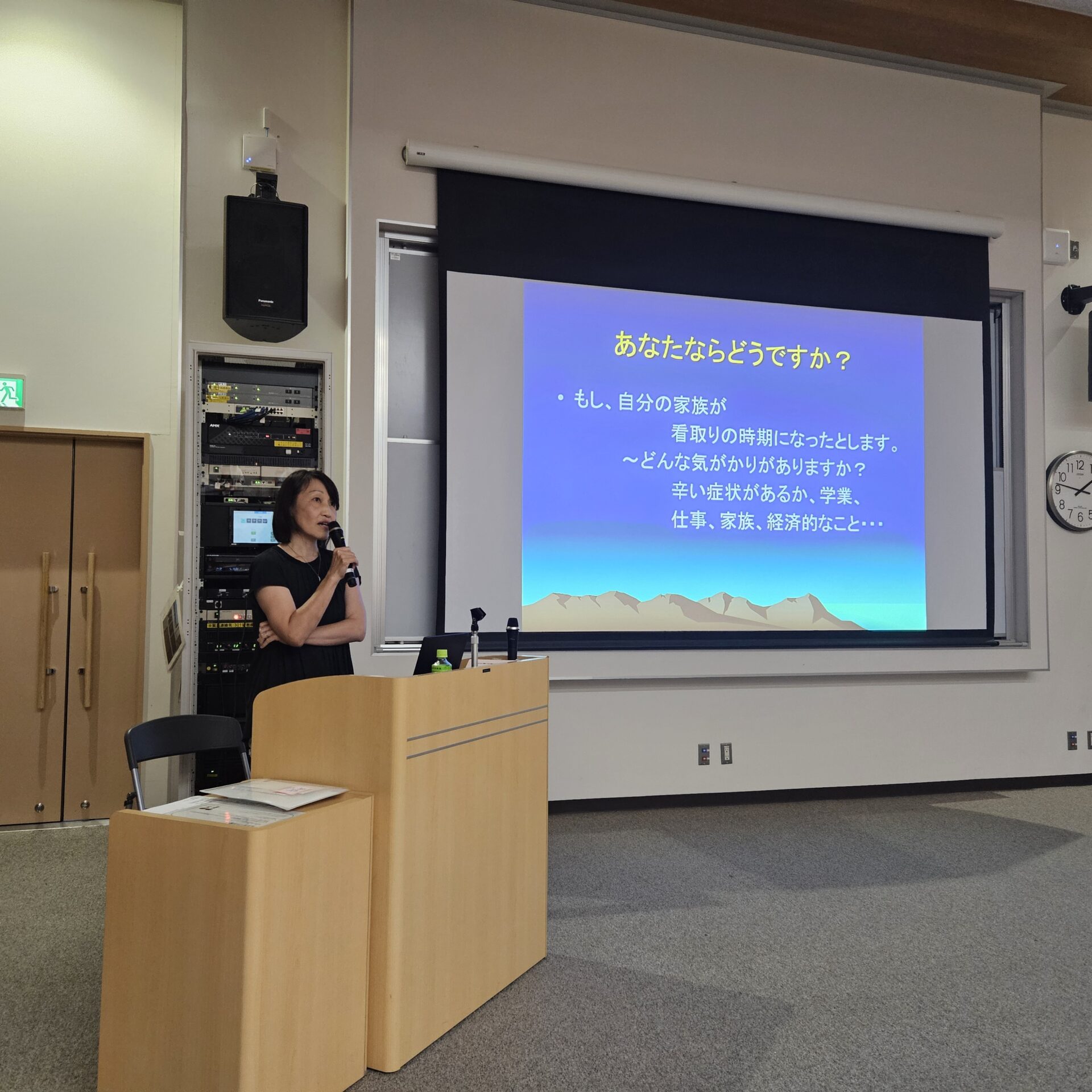講義の後半では、がんを患った男性が、診断を受けてから最期を迎えるまでの様子を家族が記録した「エンディングノート」という題名の約1時間のドキュメンタリー映像が上映されました。