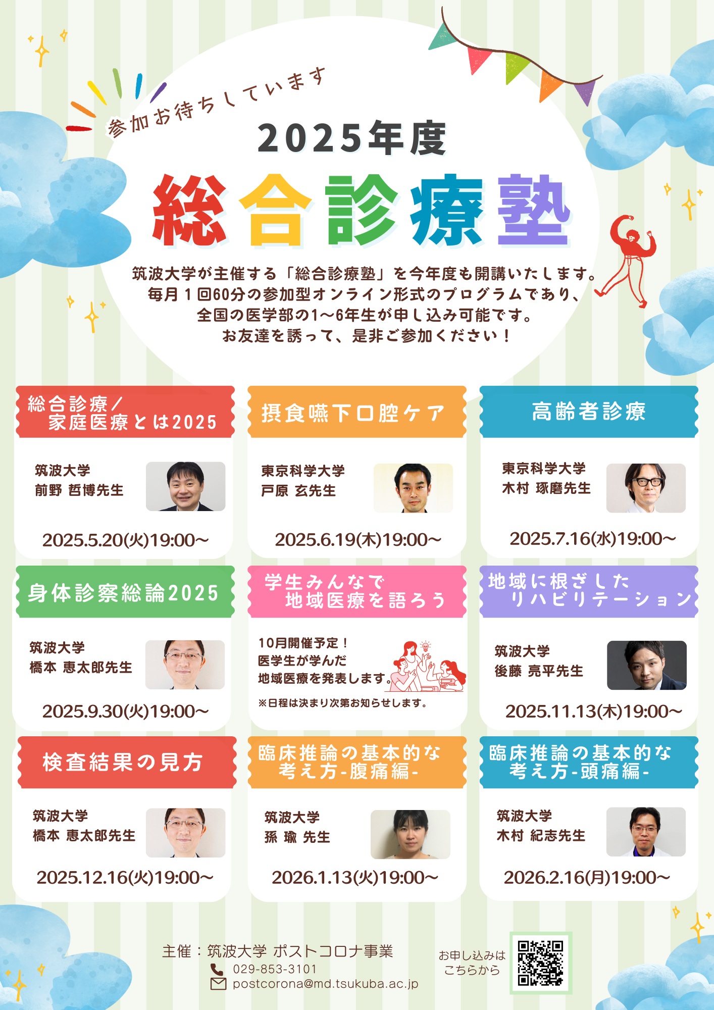令和5年度までは筑波大学の総合診療科の教員が講師をしていましたが、令和7年度は東京科学大学の木村琢磨先生(テーマ;高齢者総合機能評価)、戸原玄先生(テーマ;摂食嚥下口腔ケア)も講師に加わって下さり、より幅広いテーマを扱うことが可能となりました。