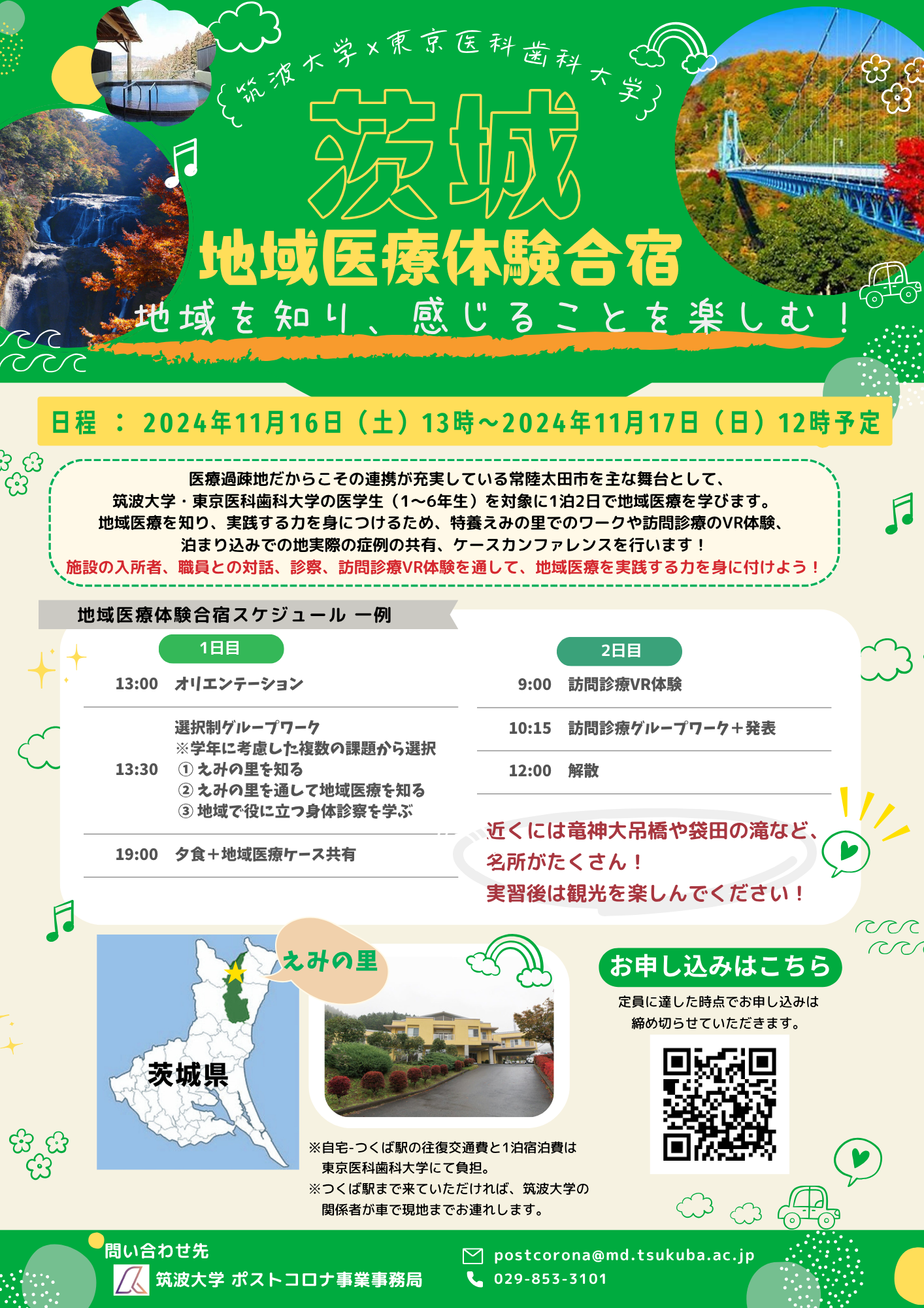 令和6年度から、東京科学大学の学生が茨城県の地域医療を学ぶ実習を年に2回、筑波大学の学生が東京科学大学の関連施設にて小児訪問診療を学ぶ実習を年に1回開催しています。筑波大学・東京科学大学のそれぞれが有する特色ある教育・研究環境を活かし、学生同士の交流や連携を通じて、従来の枠を超えた新たな学びの機会を創出しています。