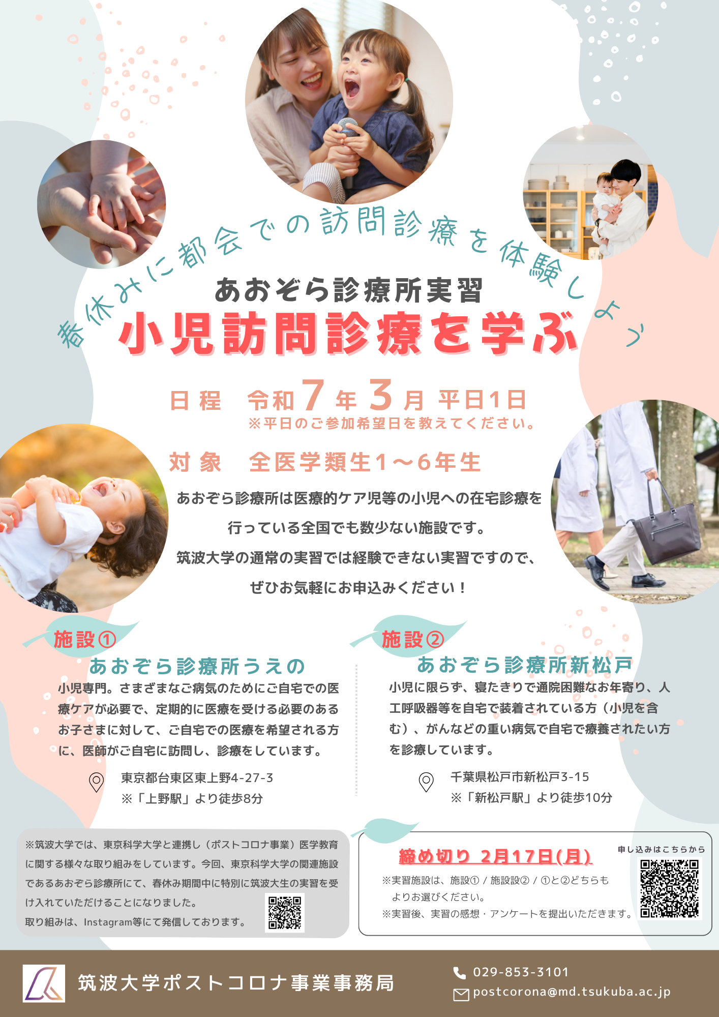 春休み中に、筑波大学の学生が東京科学大学の関連施設であるあおぞら診療所(うえの・新松戸)で実習する企画を行っています。茨城県内の実習では経験することができない医療的ケア児などへの訪問診療を学ぶ貴重な機会となっています。
