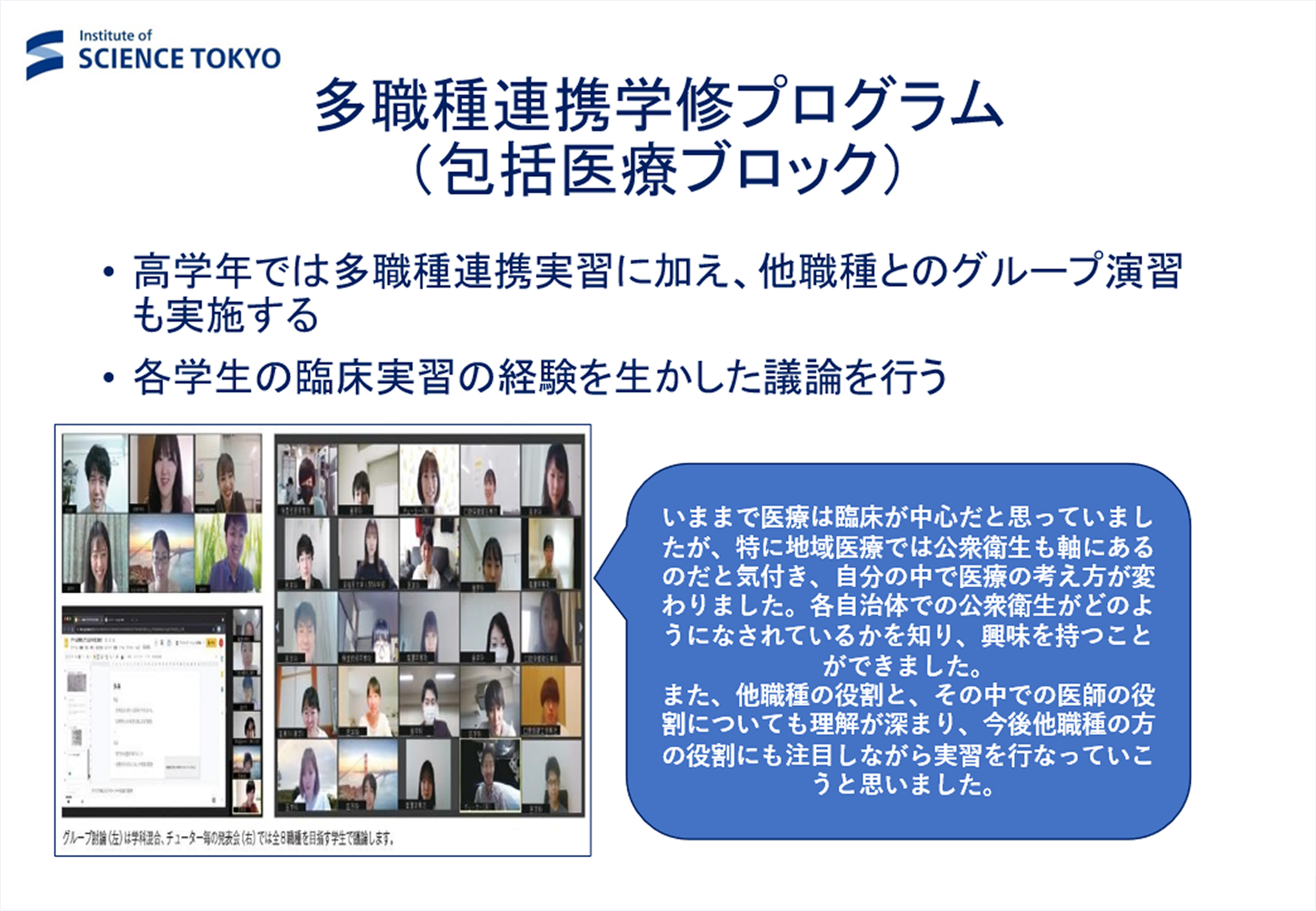総合診療、地域医療における多職種連携医療について、新規に作成する歯学部との合同アクティブラーニング授業、講義、オンデマンド教材を通して学びます。
