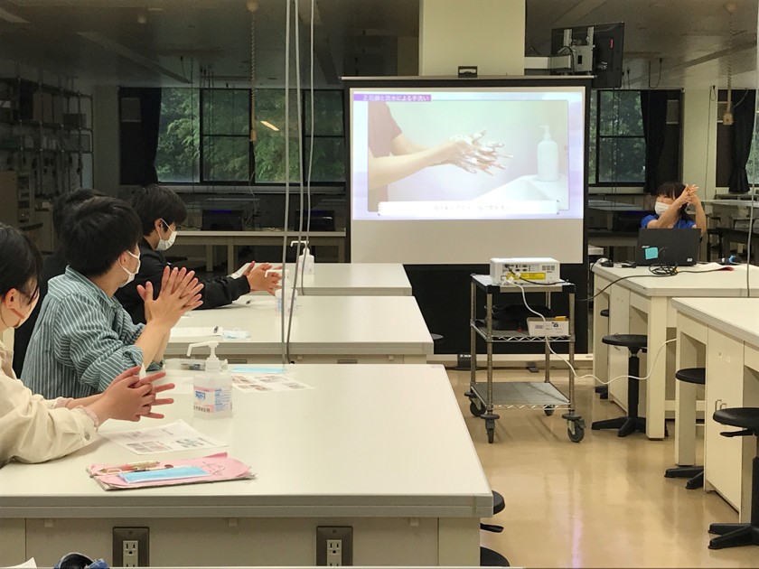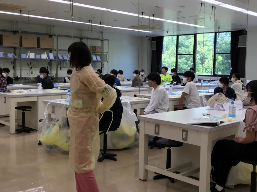 入学後間もない時期に医療者として必要な感染対策の基礎を学ぶために、正しい手洗いの方法および個人防護具の使用方法を修得するための実習を行っています。