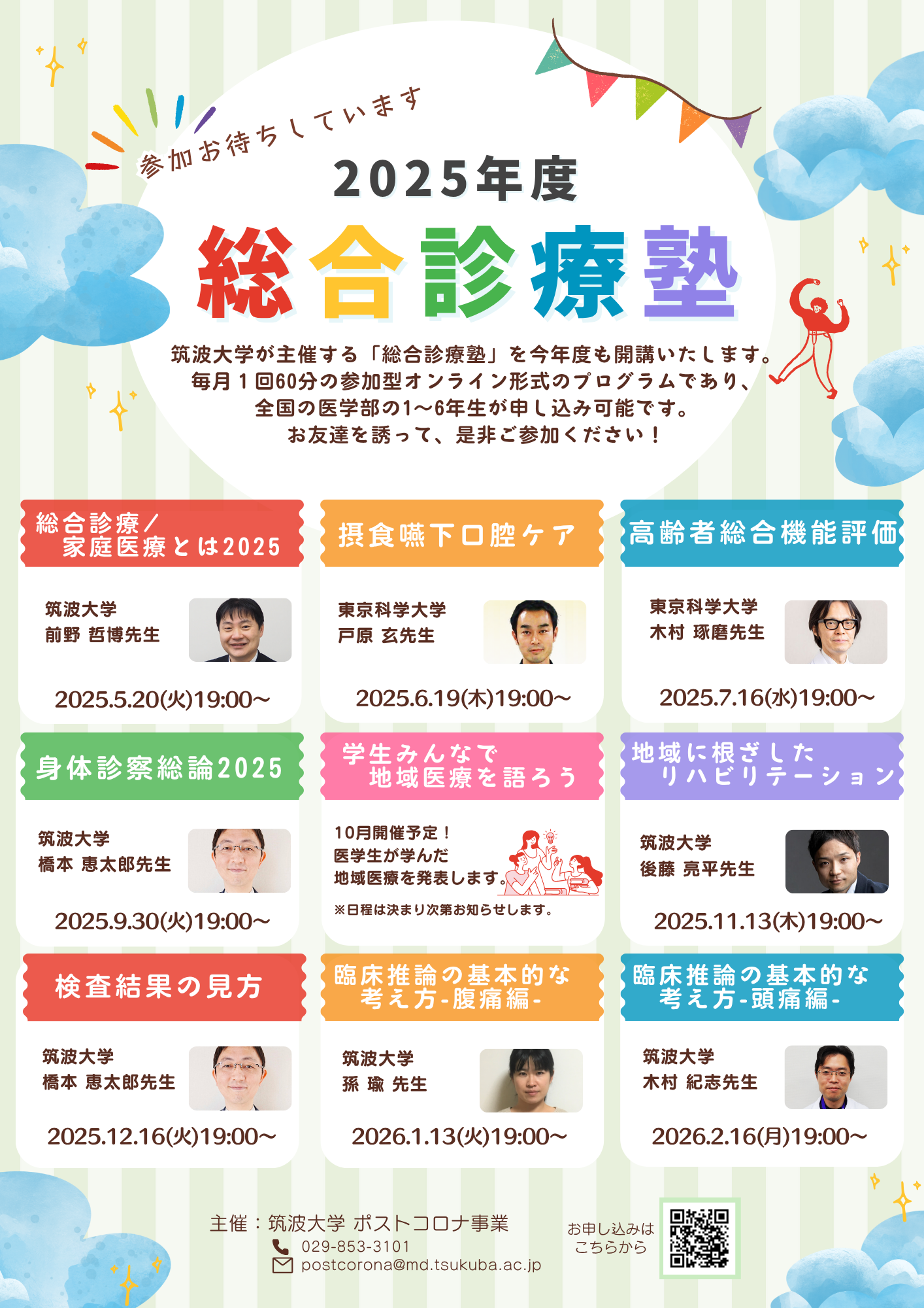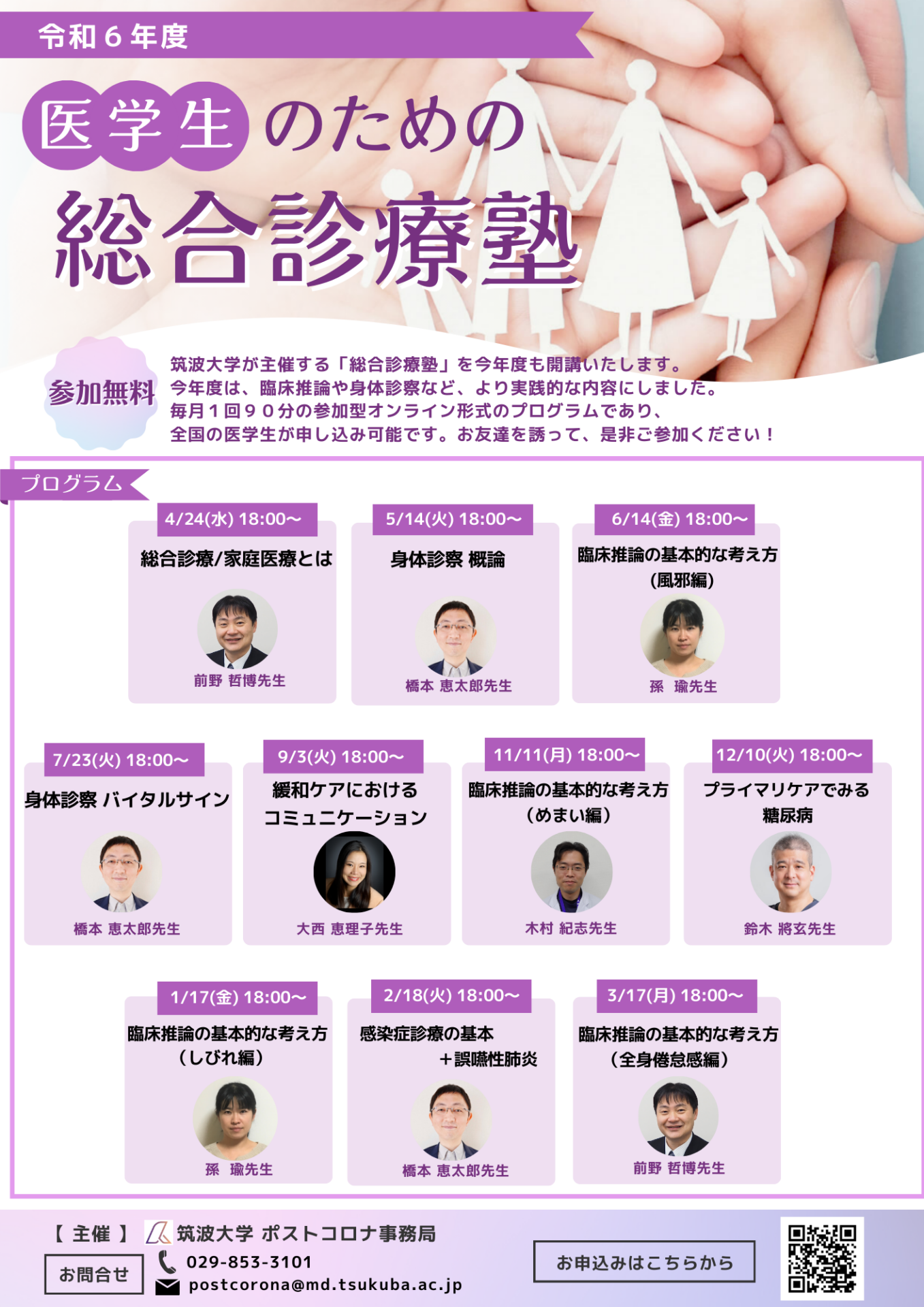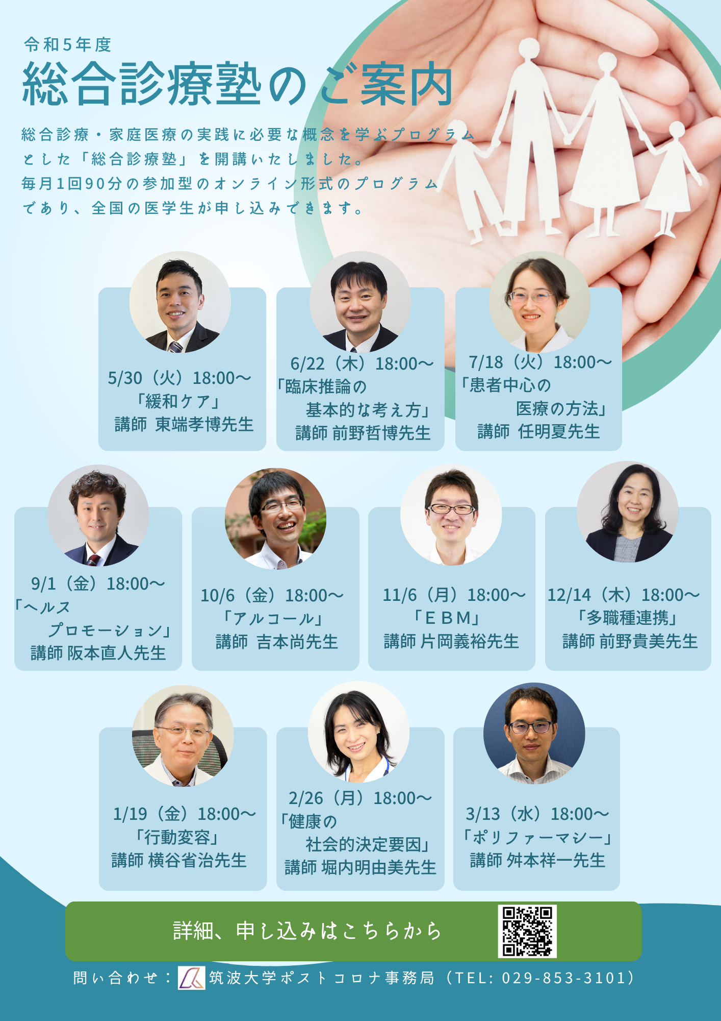 総合診療・家庭医療の実践に必要な概念を学ぶプログラムとして、全国の医学生が参加できる「総合診療塾」を令和5年度から新規に開講しました。毎月1回60分~90分の参加型のワークショップ形式のプログラムをオンラインで開催しており、テーマとしては、家庭医療学のコアの概念から糖尿病などのcommon disease、そして症候学まで多岐にわたります。