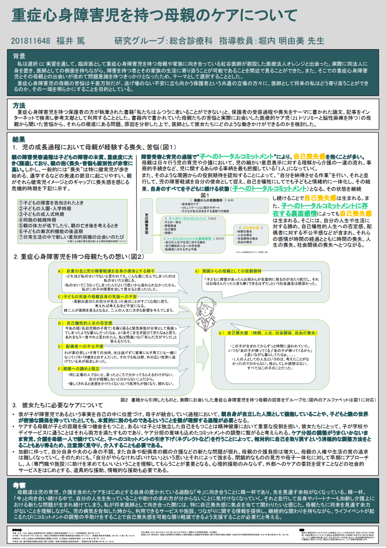 臨床実習の後半に、じっくりと学びたい診療科を選び実習するもので、総合診療科では、総合診療・地域医療に関する分野でより重点的に学びたいテーマ、フィールドについて個々の学生のニーズにあった実習を教員と相談した上で計画、実施します。北海道から沖縄まで全国の様々な地域で活躍する医療機関(約90施設)で実習を受け入れていただき、学生は大きな学びを得ています。この実習で学んだことについて、6年次7月に学年全体でクリニカル・クラークシップポスター発表会を行っており、学生は地域医療の現場での学びを担任教員の指導のもと時間をかけてポスターを作成し、発表しています。