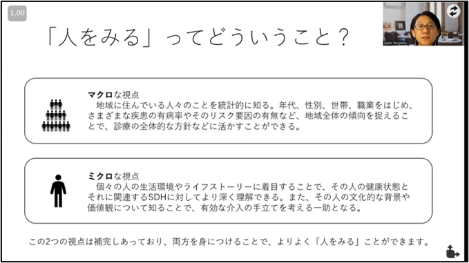 4週間の実習初日と最終日は大学にてオリエンテーションと総括を実施しています。初日には健康の社会的決定要因(SDH)に関する講義+演習、そして地域の現場での生活者としての患者像やその人生の枠組みを捉えるための医療人類学的なアプローチに関するレクチャー教材の視聴をとりいれています。学生には「4週間の実習で出会った人に対して、健康に影響を与える背景要因について情報収集、考察すること」の課題を出しています。最終日の総括では、地域医療教育学/総合診療科の教員のファシリートの元で小グループでのSDH事例発表会を実施しており、教員と学生が学び合う場にもなっています。