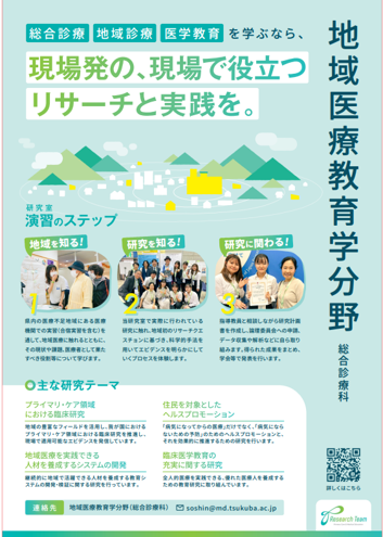 - 地域医療の抱える問題点や、将来の課題について、目の前の患者の疾患というミクロな視点から、社会の動向や医療政策を踏まえてコミュニティ全体を俯瞰できるマクロな視点まで、シームレスにとらえ、対応できる。